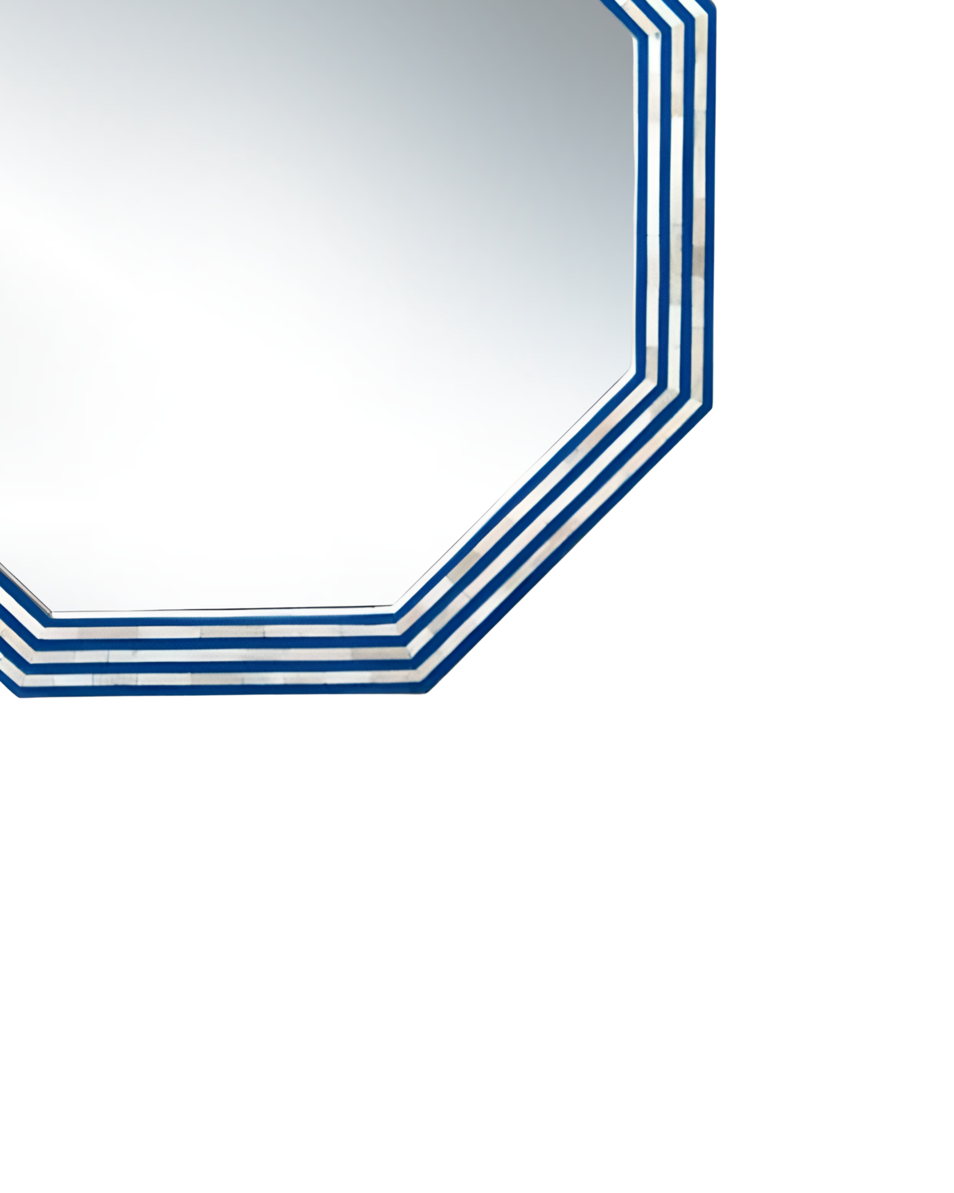 This octagonal mirror features a meticulously crafted bone inlay frame with vivid blue and white stripes, creating a distinctive statement piece. Its geometric design combined with vibrant patterns infuses a contemporary twist into classic artistry. Ideal for entryways, living areas, or bedrooms, this mirror enhances any space with added dimension, illumination, and artistic flair while serving both practical and decorative purposes.