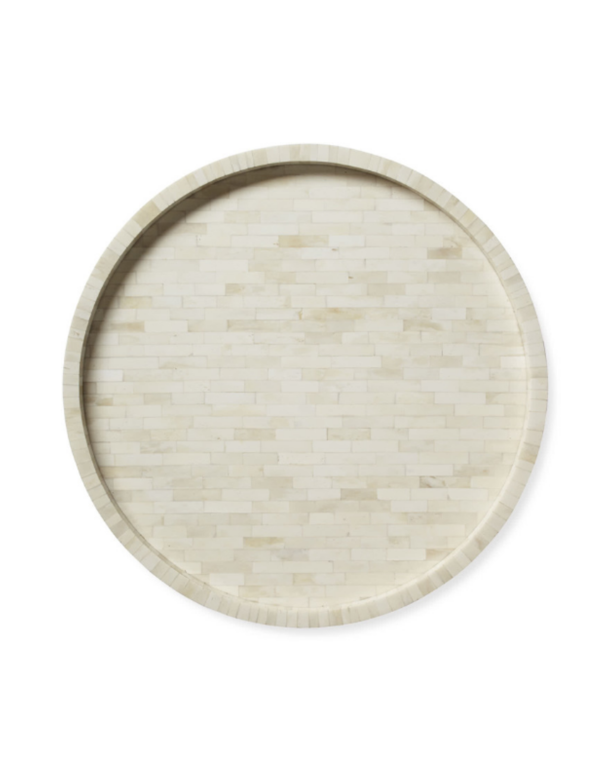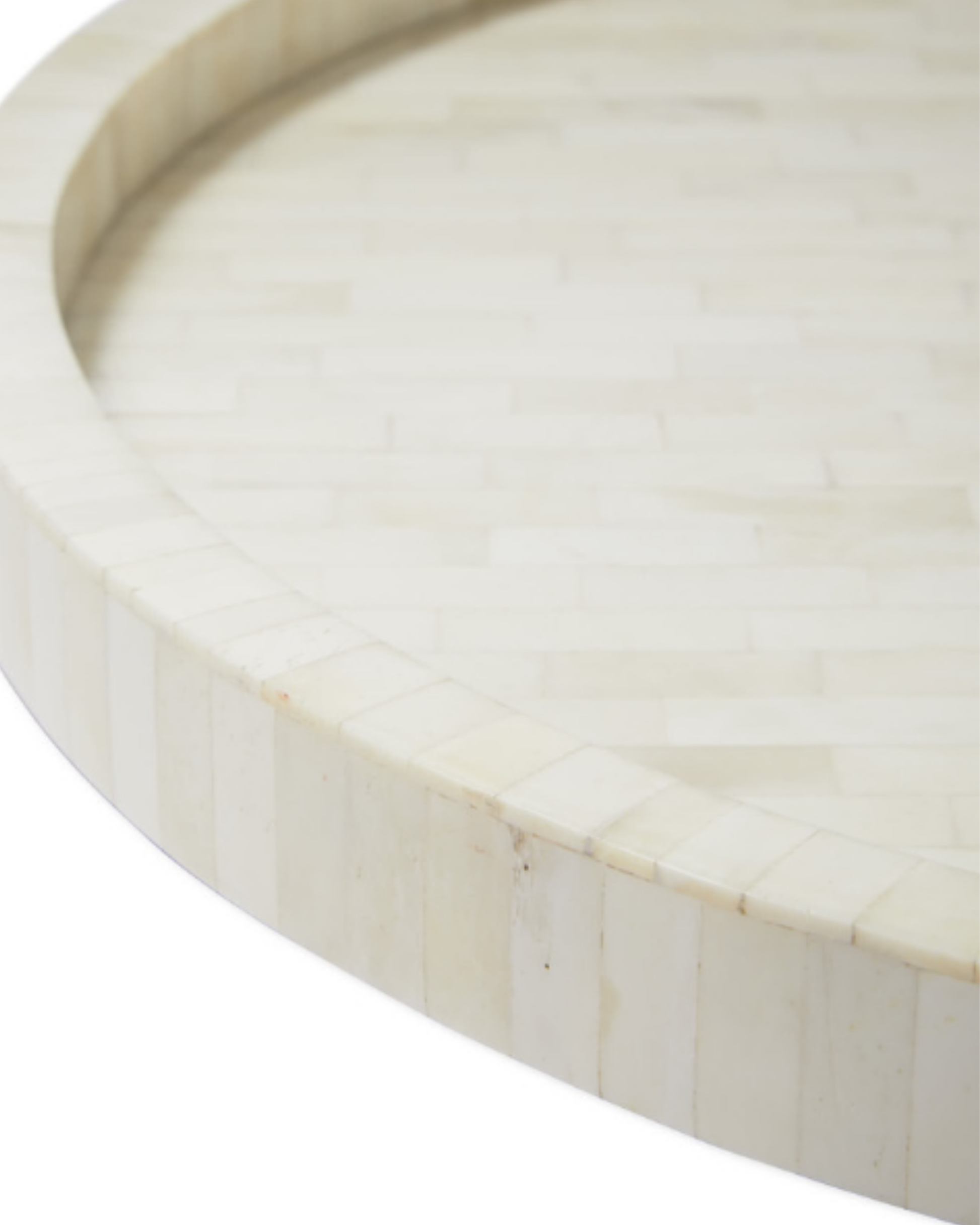 This elegantly handcrafted round tray features a sophisticated ivory bone inlay arranged in a delicate brickwork pattern. Its minimalist design offers timeless versatility, ideal for serving, organizing, or enhancing your coffee table display. Combining skilled craftsmanship with contemporary simplicity, this tray brings subtle luxury to any environment.