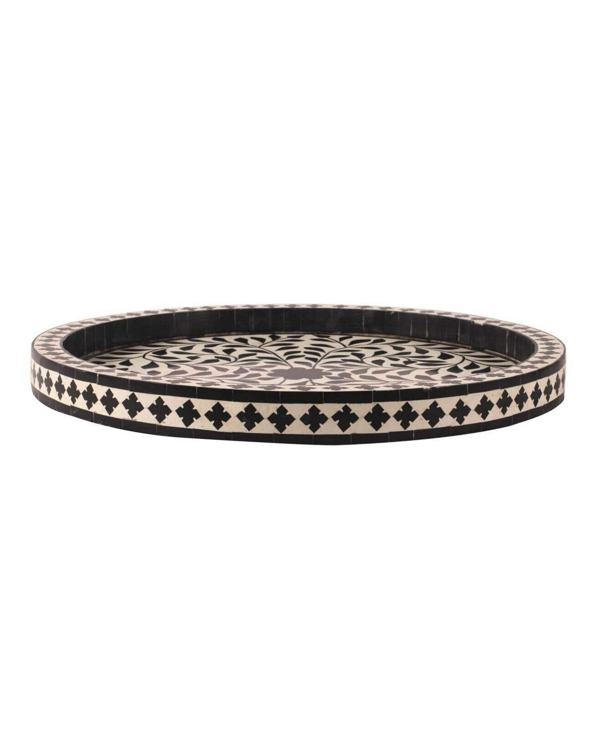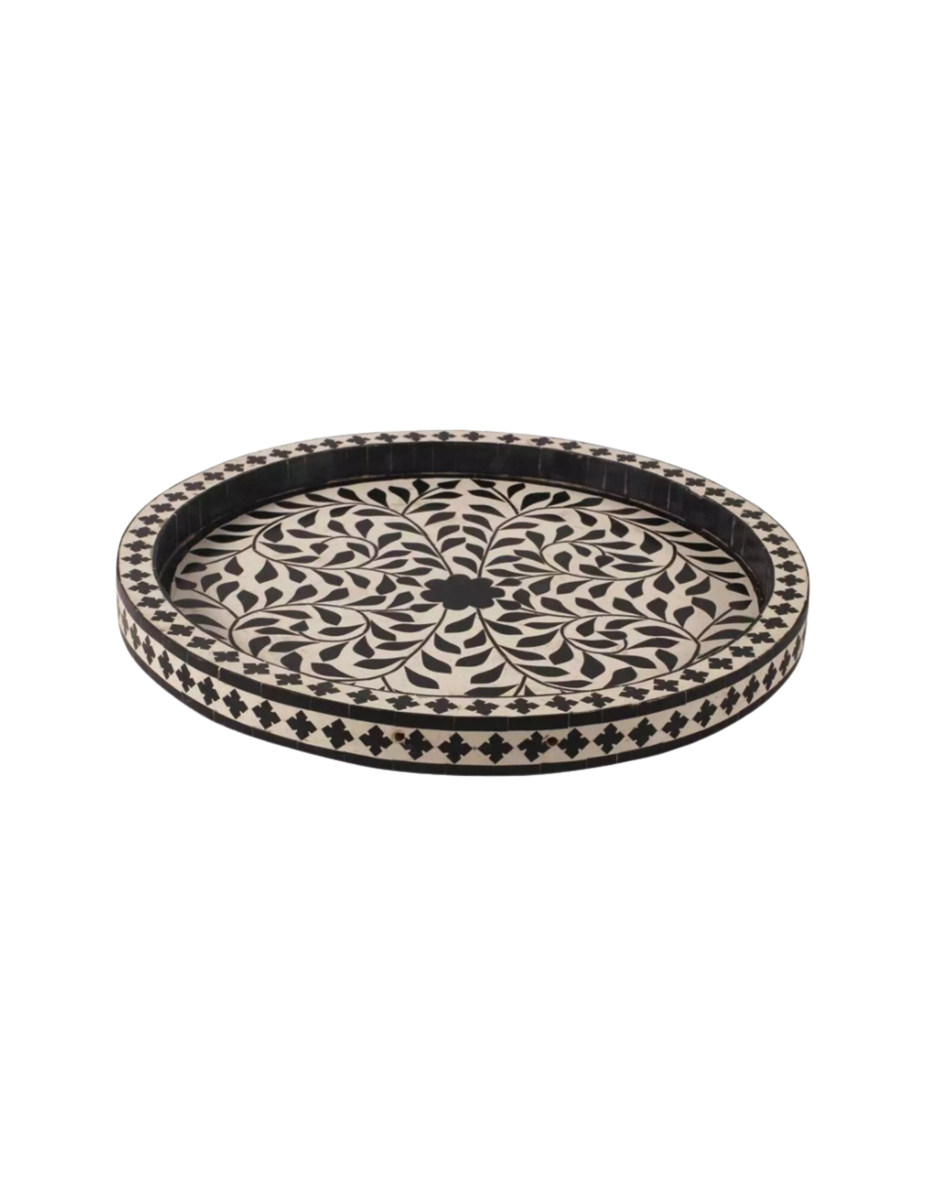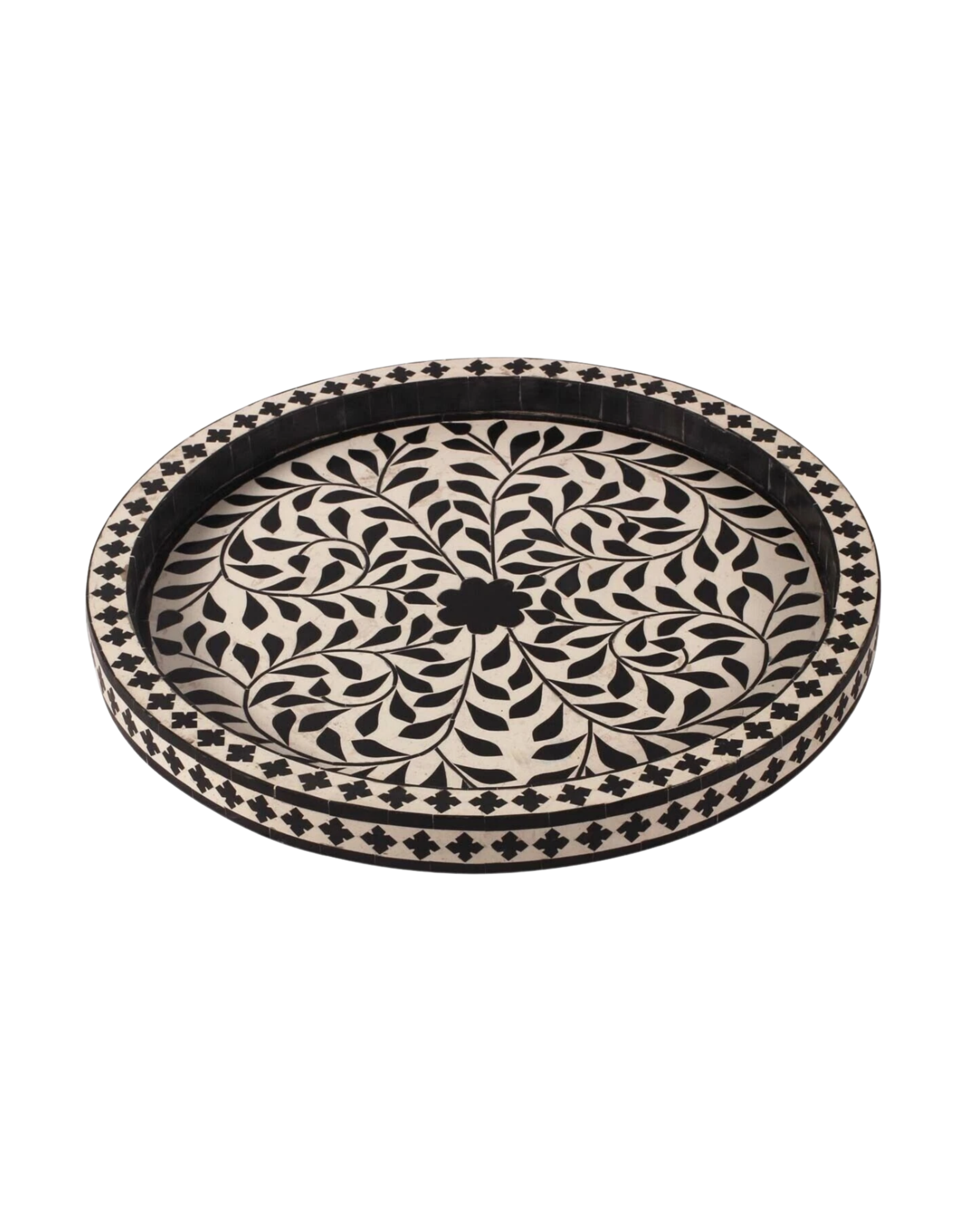 Created by expert artisans, this round tray showcases a detailed floral vine motif in black bone inlay. The ornate border elegantly frames the design, making it an exceptional choice for serving or enhancing your home décor. Ideal for coffee tables, dining areas, or as a stylish accent, it seamlessly blends enduring craftsmanship with modern appeal.