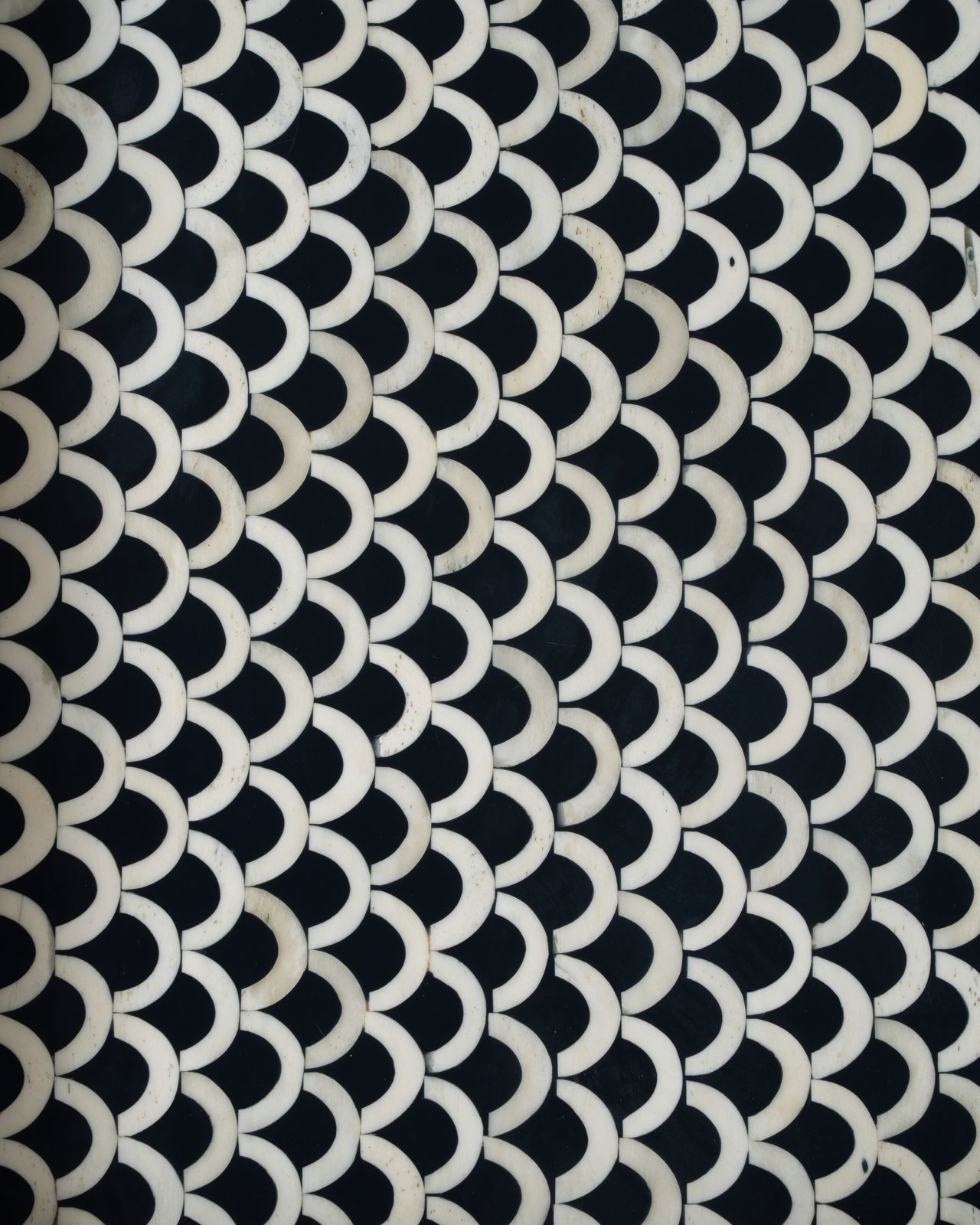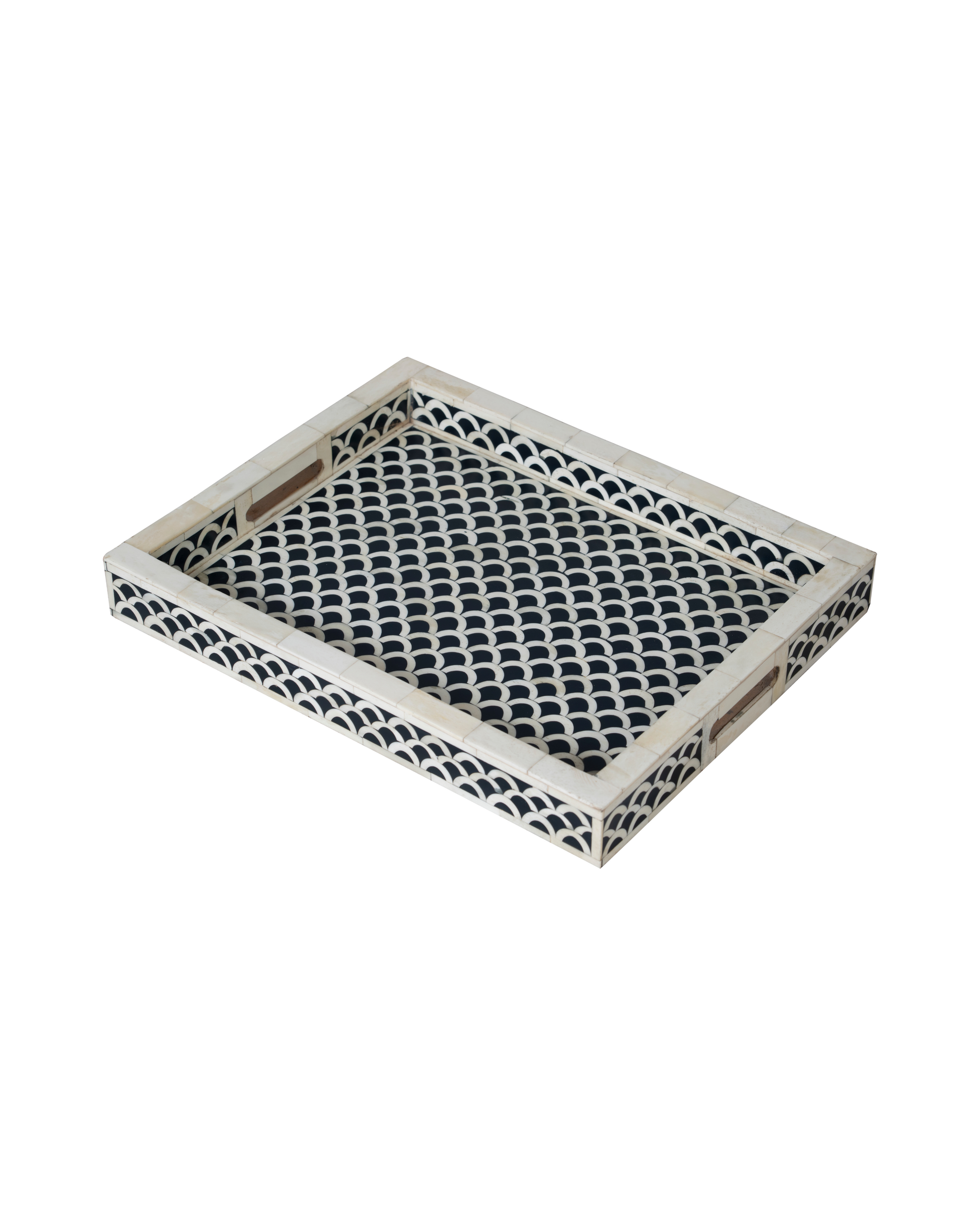 This meticulously handcrafted bone inlay tray features a distinctive scallop design in monochrome black and white. Its refined aesthetic and precise craftsmanship make it ideal for serving or decorative use, adding a touch of sophistication to contemporary and classic interiors alike.