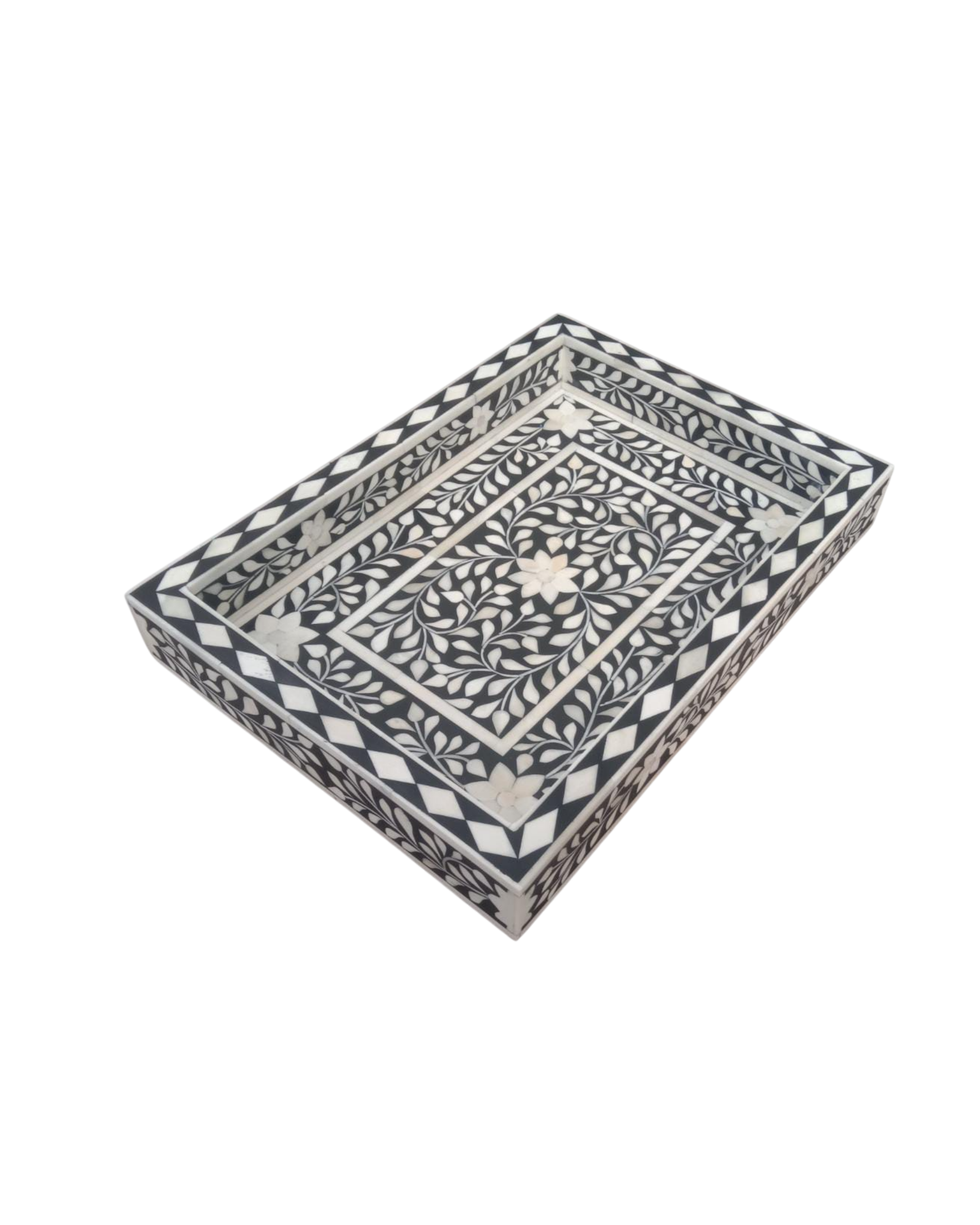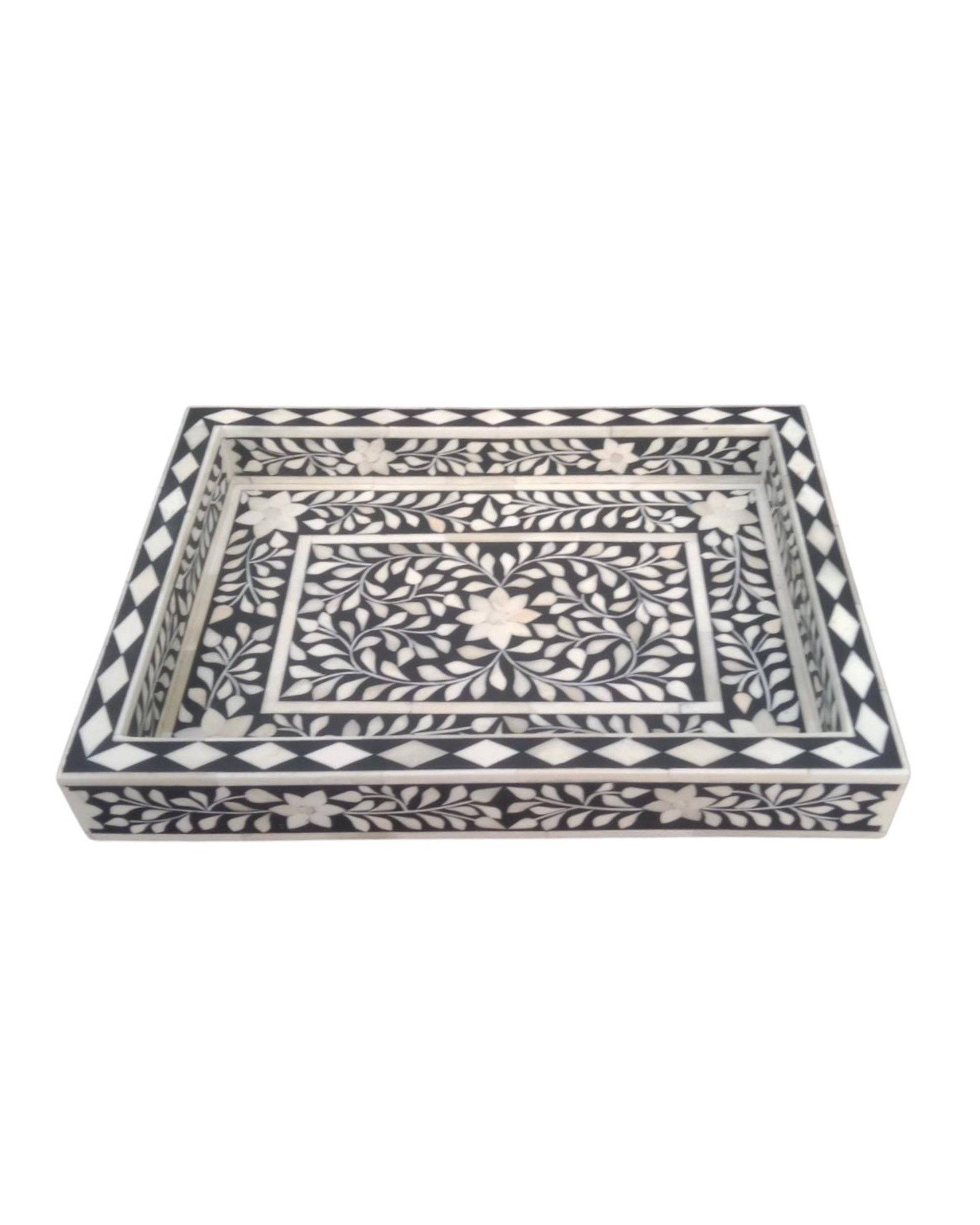 This rectangular tray, beautifully handcrafted with traditional bone inlay methods, features a bold black and white floral design bordered by geometric patterns. It seamlessly blends classic craftsmanship with contemporary functionality, making it ideal for serving, accentuating a coffee table, or enhancing any space with elegance.