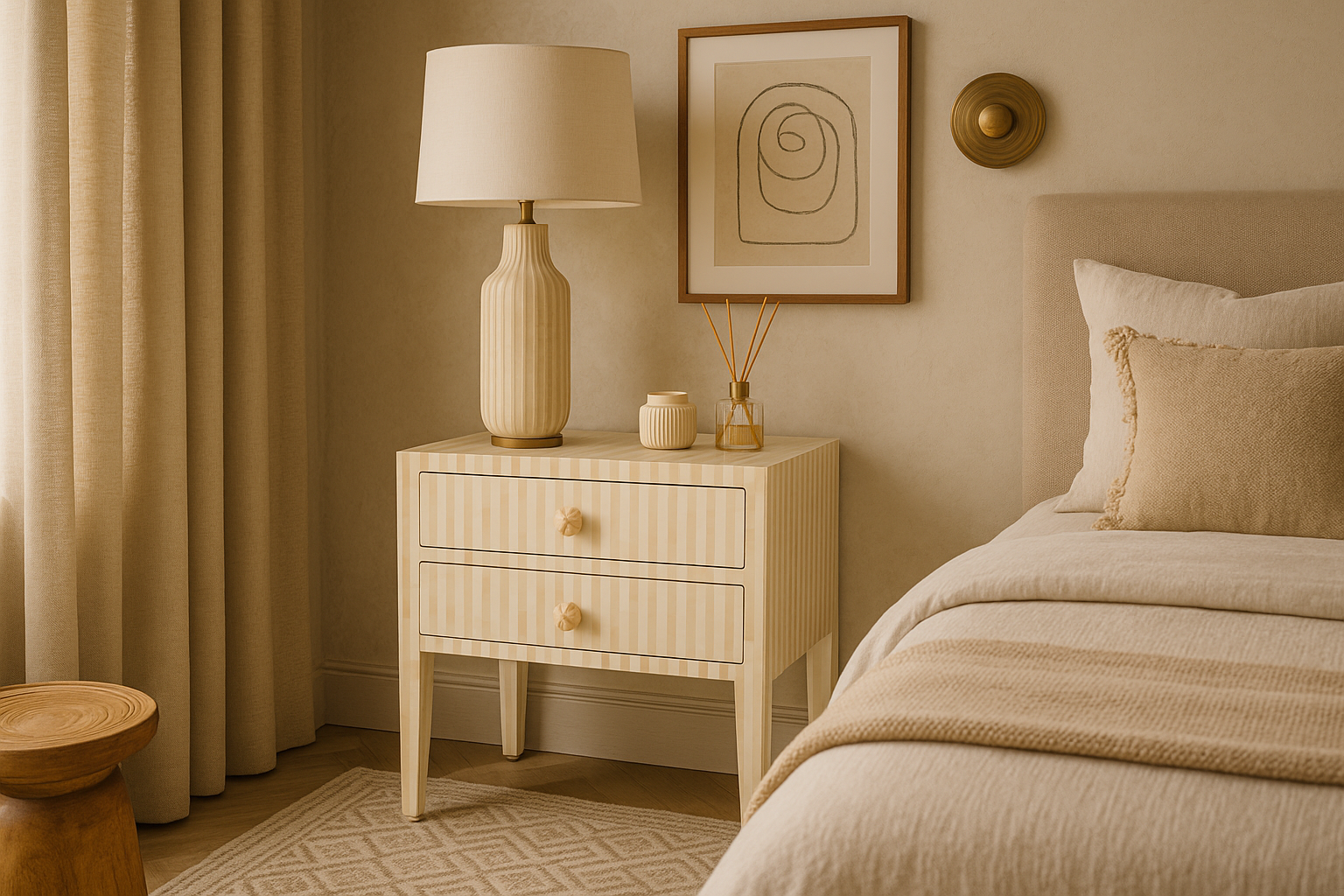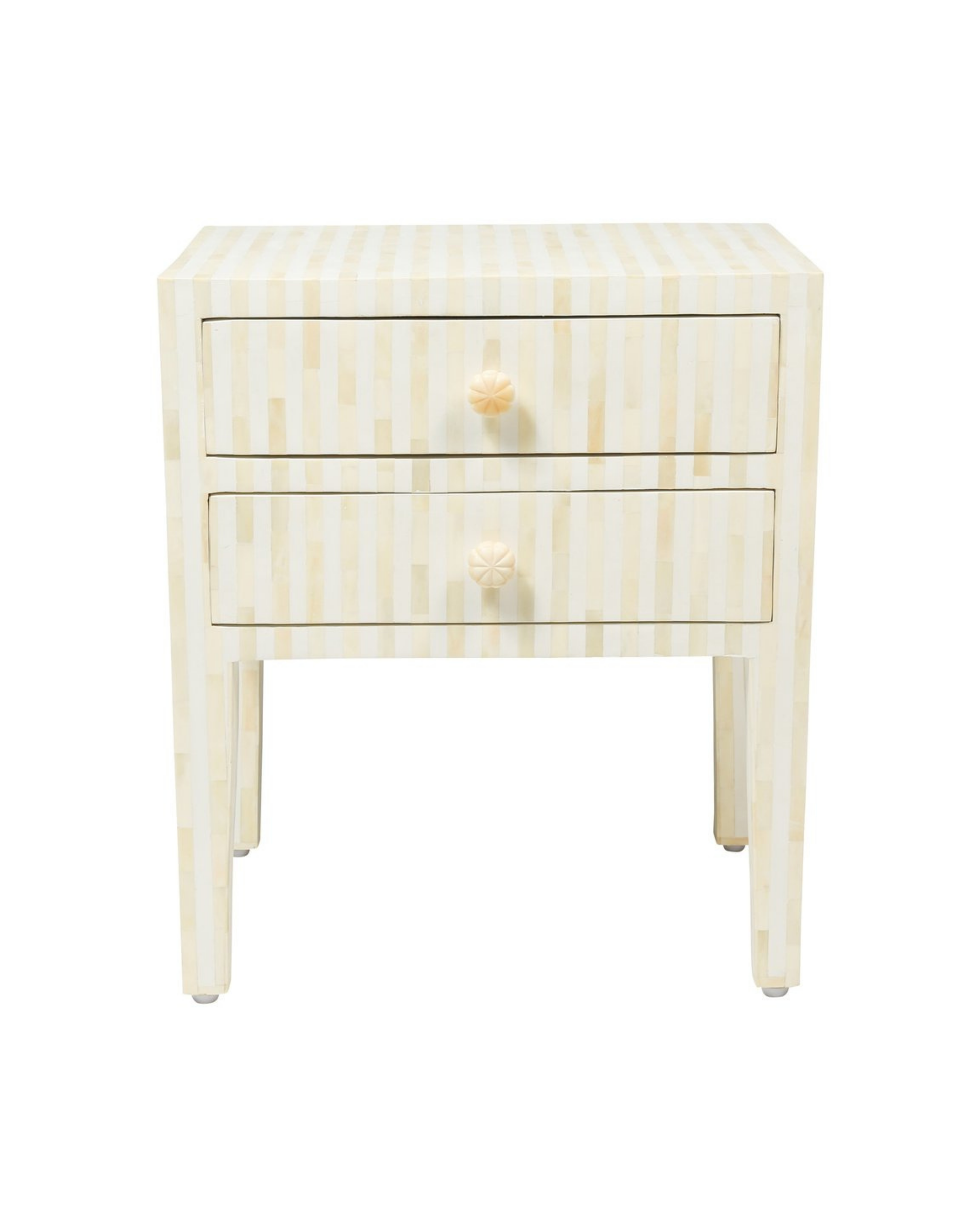 Eila Nightstand presents a harmonious blend of skilled craftsmanship and minimalist design, highlighted by a gentle striped pattern in natural ivory shades. Featuring two ample drawers and elegant floral knobs, it delivers both practicality and subtle sophistication.